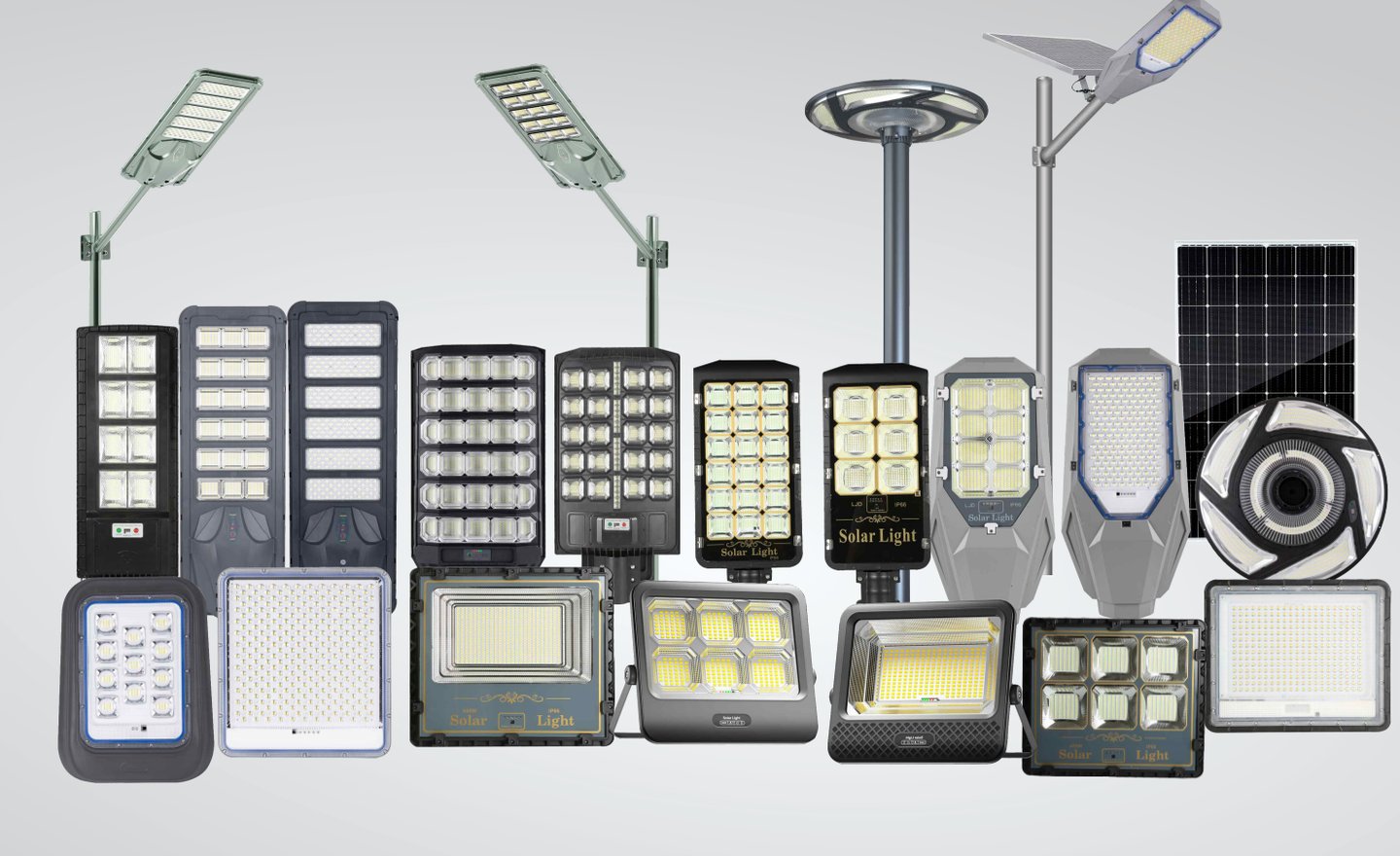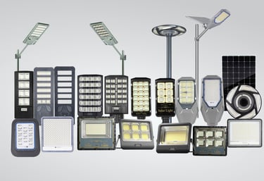 Comprehensive range of solar garden lights, wall lights, and flood lights for residential and commercial projects.